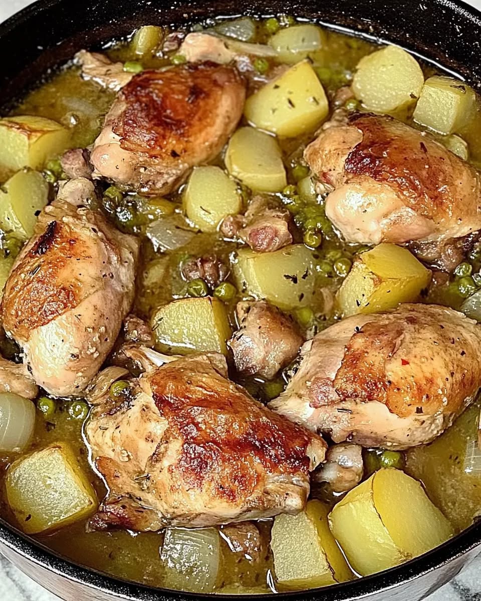 1 pollo tagliato a pezzi (cosce e sovracosce vanno benissimo) 4 patate medie, sbucciate e tagliate a cubetti 200 g di piselli (freschi o surgelati) 1 cipolla grande, affettata 1 spicchio d’aglio (facoltativo) Olio d’oliva q.b. Sale e pepe q.b. Rosmarino o prezzemolo (facoltativo) 1 bicchiere d’acqua o brodo